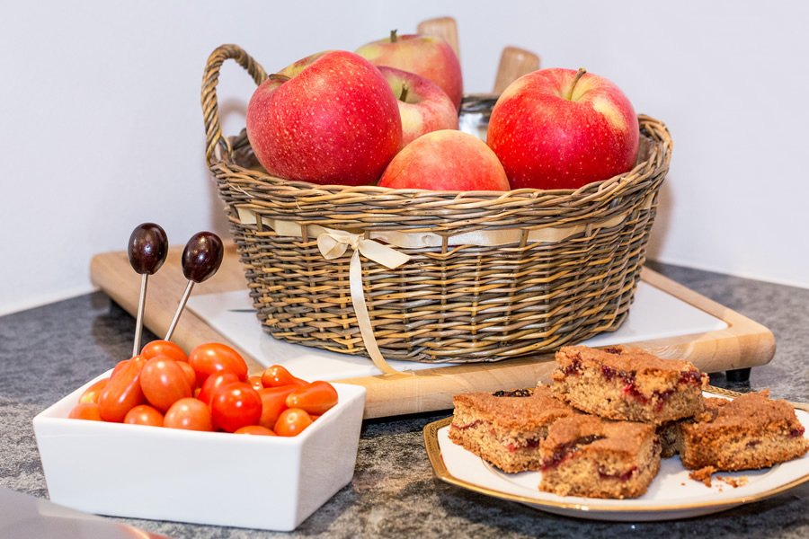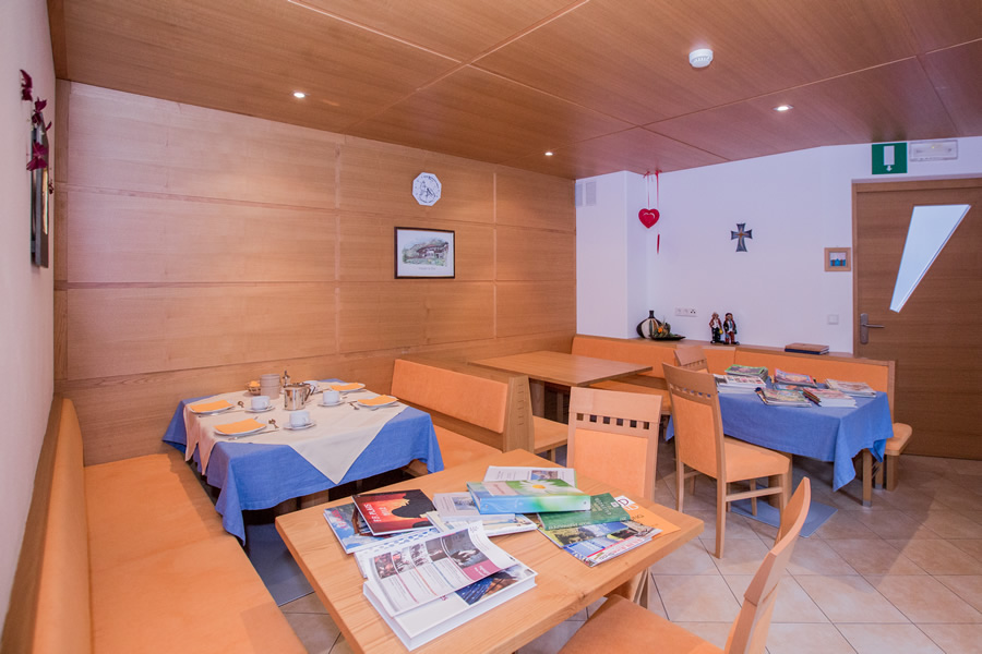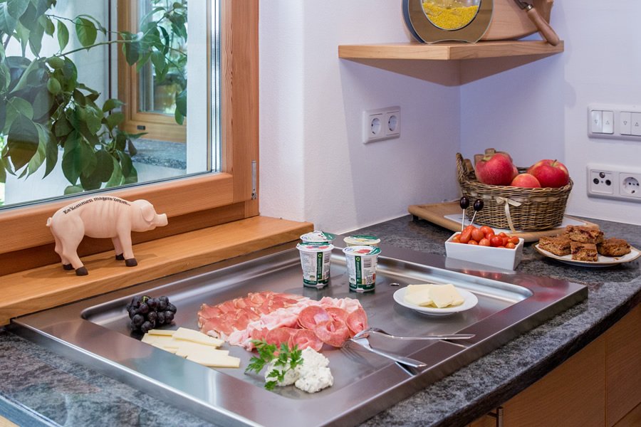 Gerne bereiten wir Ihnen auf Wunsch ganzjährig in unserem Aufenthaltsraum in der Zeit von 8.00 – 10.00 Uhr ein Frühstückbuffet vor.Genießen Sie dabei eine reiche Auswahl an verschiedenen Produkten. Dazu gehören Kaffee, Tee, Milch Kakao für die Kinder, Brot, Butter, Honig, Wurst, Speck und Käse, Joghurt und Müsli. Nach Möglichkeit verwenden wir dabei immer Produkte aus Südtirol. Dazu kommen unser Apfelsaft und verschiedene Marmeladen, die wir selber herstellen. Je nach Jahreszeit gibt es auch verschiedenes Obst und Nüsse aus unserem Garten sowie Gemüse. Dieses können Sie mit dem selbst hergestellten Kräutersalz verfeinern.